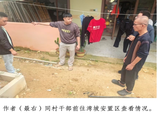湾坡安置区一位住户反映,对面邻居把路面硬化加高了,一下大雨,雨水全往自家灌。我跟着村干部去看现场,两栋楼之间一条几米宽的过道,一侧高、一侧低,低处那户门前正对着一个陡坡。大雨天,泥水顺着坡冲下来,高处的户主怕自家被淹,就把门口路面加高,结果低处那户更惨了。