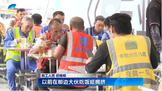 务工人员 初维明:自从“椰风餐驿”修完,确实方便不少,起码下雨天大伙吃饭都方便多了,都有地方坐。以前在那边大伙吃饭挺拥挤,还没有地方坐,自从这个修完方便多了,确实很好,卫生、环境都挺好的。